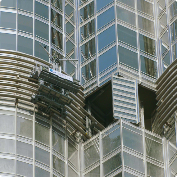 Track-mounted units and manned cradles keep the tower’s exterior clean and well maintained. It normally takes three to four months to clean the tower’s entire exterior.